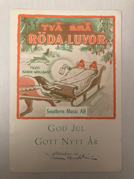 En charmig bild med motiv av TVA SMA RÖDA LUVOR, text av Karin Wollgast och utgiven av Southern Music AB. Den innehåller även en "God Jul" och "Gott Nytt År" hälsning.