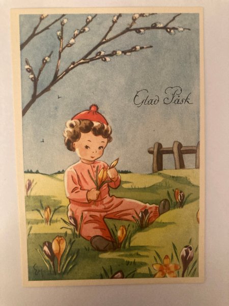 Ett sött påskkort med en illustration av ett barn som sitter i gräset med krokusar och en gren med videkissar. Texten "Glad Påsk" är tryckt på kortet.