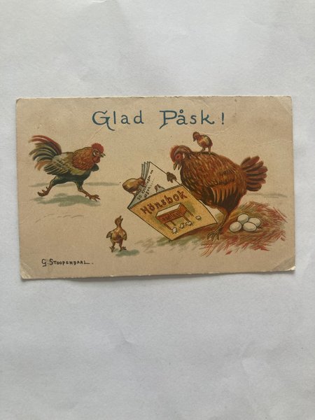 Ett sött påskkort med en tupp, höna och kycklingar. Hönan läser hönsbok. Signerad G. Stoopendaal. Hörnveck