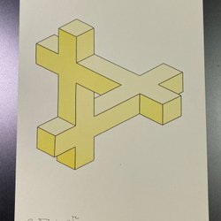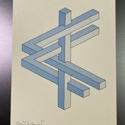 Ett tryck av Oscar Reutersvärds "Omöjliga Figur". 21 x 15 cm.Tryckt av Jabe Offset AB, Lund 1986.