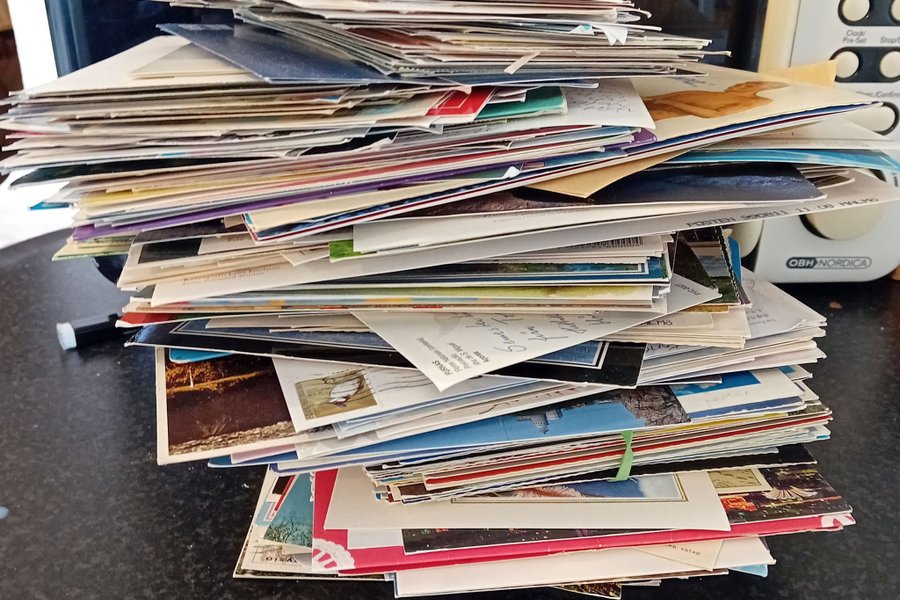 En hög osorterade vykort.