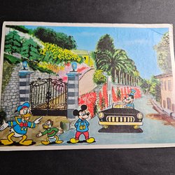 Vykort med motiv av ängsblommor och en fjäril. Kortet är poststämplat och har frimärken.