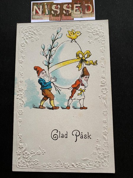 2 tomtar bär påskägg Relief