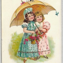 Ett vackert vykort med motiv av ett kärlekspar omgivet av änglar och blommor. Texten på kortet är handskriven. Guld/relief