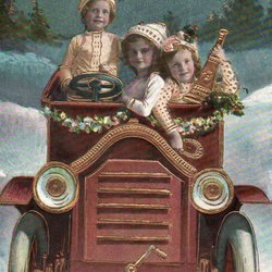 Ett vackert vykort med motiv av ett kärlekspar omgivet av änglar och blommor. Texten på kortet är handskriven. Guld/relief