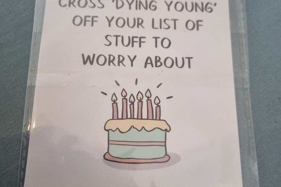 Ett grattiskort med texten "You can cross 'dying young' off your list of stuff to worry about" och en bild av en tårta.