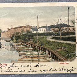 Ett vykort föreställande Eskilstuna, Rademachergatan med smedjorna. Axel Eliassons Konstförlag A.-B., Stockholm. Handkolorerat foto. Svensk tillverkning.