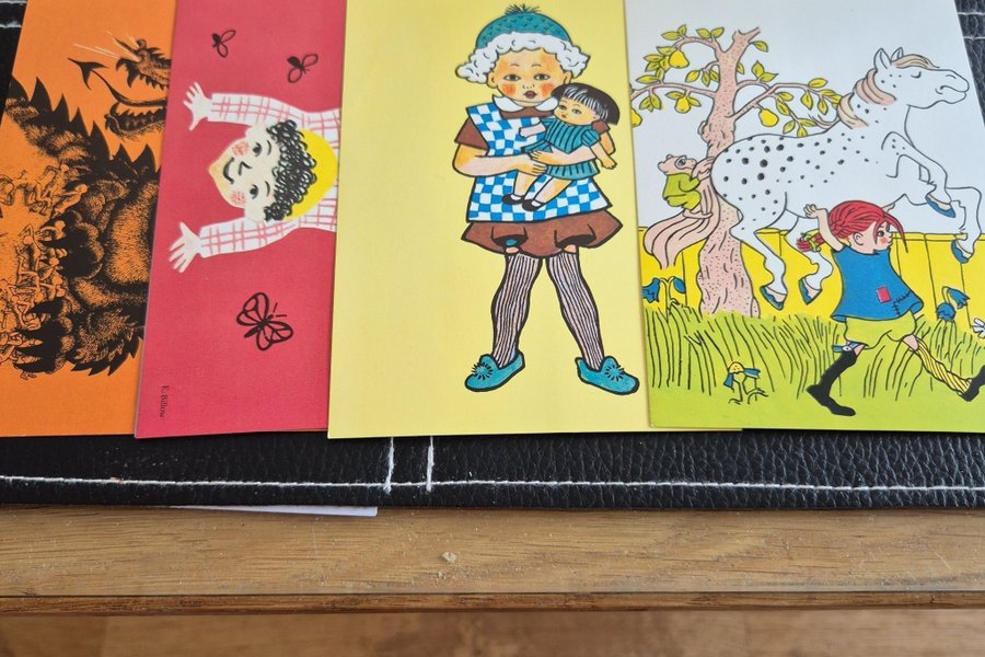Färgglada Barnvykort med olika motiv. Ett vykort föreställer en drake, ett annat en flicka med fjärilar, ett tredje med Bullerbyn och det Fjärde med Pippi Långstrump