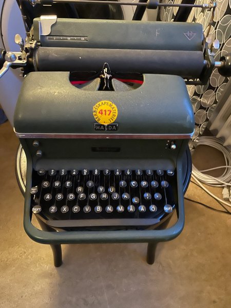 Skrivmaskin av märket Halda. Modellen har ett QWERTY-tangentbord med svenska tecken (Å, Ä, Ö). Färg: grön.