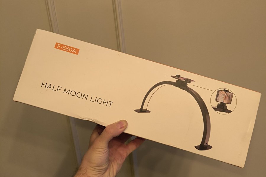 Half Moon Light F-550A är en belysningslösning designad för att ge jämn och skuggfri belysning. Den halvmåneformade designen är lämplig för olika användningsområden som skönhetsbehandlingar, fotografering och videoinspelning. Lampan är utrustad med en hållare för mobiltelefon, vilket gör det enkelt att filma eller ta bilder samtidigt som du har optimal belysning.