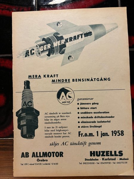 En retro annons för AC tändstift. Annonsen framhäver fördelarna med AC tändstift, inklusive jämnare gång, lättare start och snabbare acceleration. Den anger också att AC tändstift säljs genom AB Allmotor och Huzells från och med 1 januari 1958.