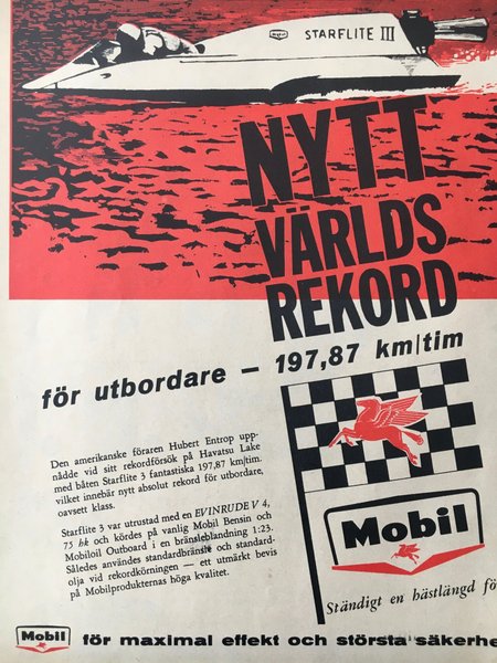 En annons som visar Starflite III båten som slog nytt världsrekord med Mobil bensin. Affischen visar en båt och texten "Nytt Världsrekord 197,87 km/tim".