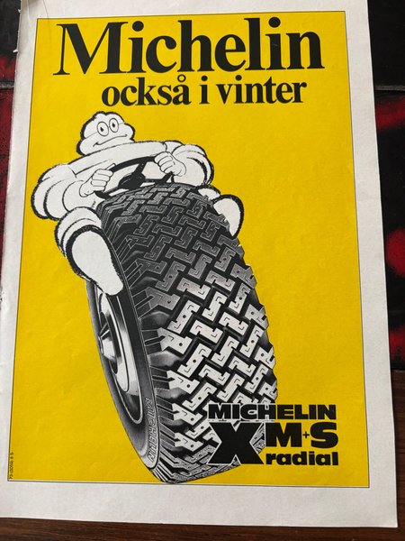 En annons med Michelin motiv. Affischen visar Michelin-mannen bakom ratten på ett däck. Texten lyder "Michelin också i vinter" och "Michelin X M+S radial".