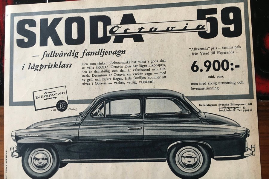 En annons för SKODA Octavia 1959 Reklamen beskriver bilen som en fullvärdig familjevagn i lågprisklass. Den framhäver dess låga inköpspris, driftskostnad och slitstyrka, samt dess vackra design med ny grill och läckra färger.