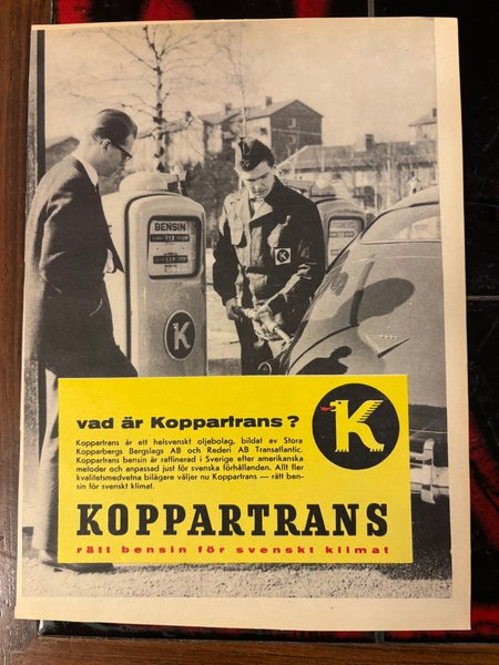En annons för Koppartrans, rätt bensin för svenskt klimat. Bilden visar en bensinstation med personal.