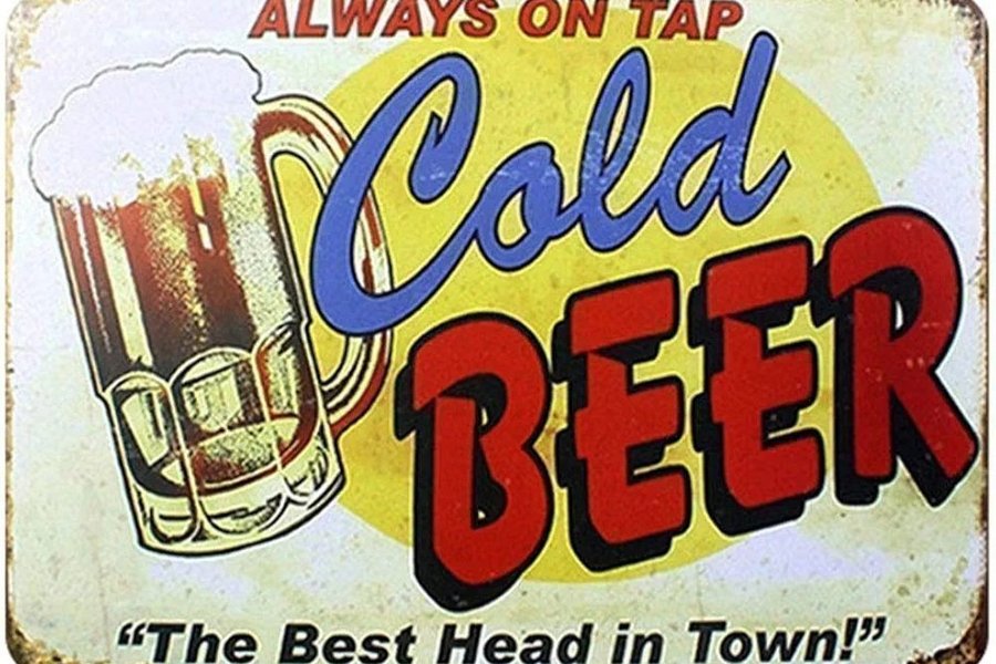 En dekorativ metallskylt med texten "Always on tap Cold Beer The Best Head in Town!"