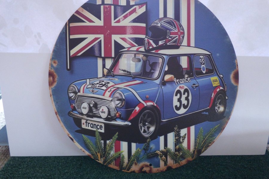 En snygg skylt med en BMC COOPER Skylten är rund 20 cm i diameter