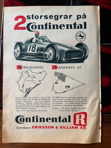 Annons för Continental däck med fokus på framgångar i Grand Prix-lopp. Bilden visar en racerbil med nummer 18 och texten "2 storsegrar på Continental". Annonsen nämner Nürburgring och Frankrikes GP, med resultat för J. M. Fangio och Hans Hermann, båda i Mercedes. Generalagenten anges som Eriksson & Gilljam AB.