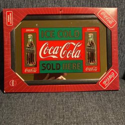 En äldre Coca-Cola spegel med texten ”Delicious Coca-Cola Relieves Fatigue The Most Refreshing Drink In The World”.