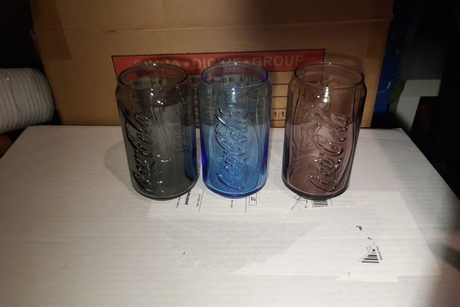 Set med tre Coca-Cola glas i olika färger: ett grått, ett blått och ett brunt glas. Glasen har den klassiska Coca-Cola-logotypen präglad på sidan.