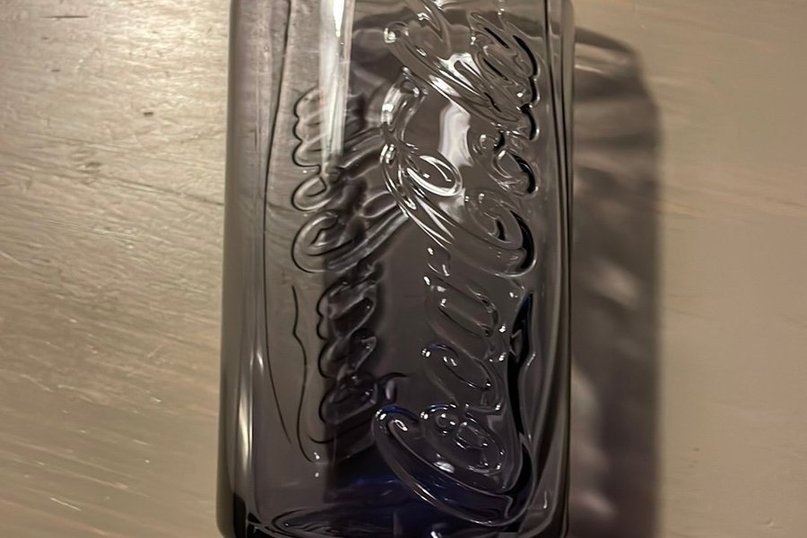 Ett glas med Coca-Cola-logotypen präglad på sidan. Glaset har en lila nyans.