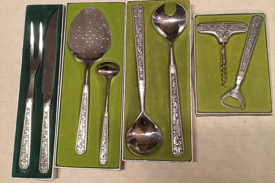 Detta bestickset innehåller Salladsbestick,Fisk bestick,Skinkbestick,Korkskruv,Flasköppnare.
