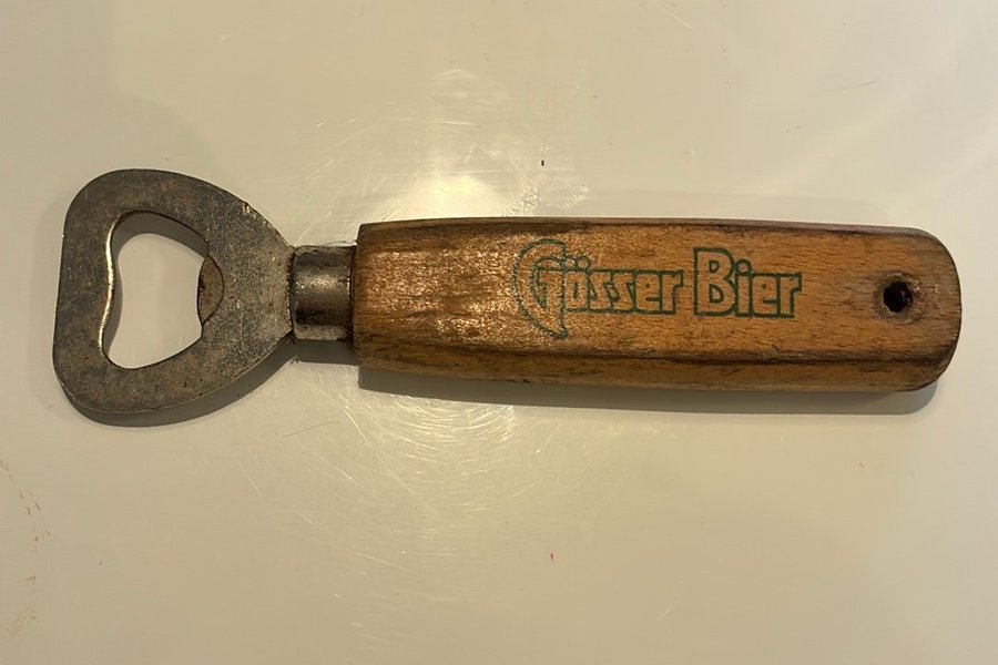 Flasköppnare med trähandtag. Texten "Gösser Bier" är tryckt på handtaget. Tydlig men fin patina.
