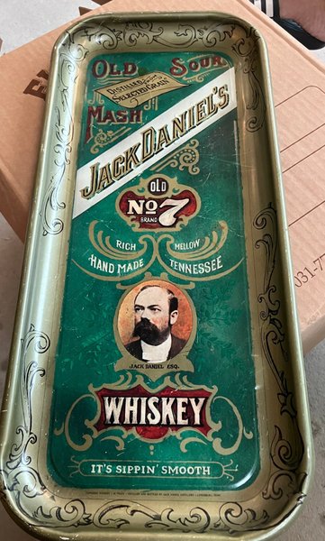 Serveringsbricka med Jack Daniel's Old No. 7 Brand Whiskey-motiv. Brickan har texten "Old Sour Mash", "Rich Hand Made Mellow Tennessee" och "It's Sippin' Smooth". En bild på Jack Daniel, Esq. är också tryckt på brickan.
