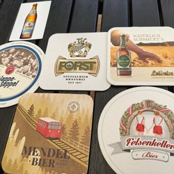 Ett gäng blandade ölunderlägg med olika tryck och märken.