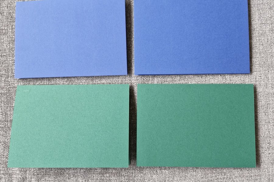 4 korrespondenskort i lite styvare papper. Korten är enfärgade och dubbelvikta och det finns därför gott om plats att skriva på.