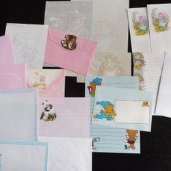 Ett parti med brevpapper och matchande kuvert. Motiven inkluderar bland annat djur, slott och naturscenerier. Färgerna är pastell och designen är varierad.