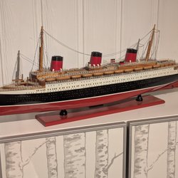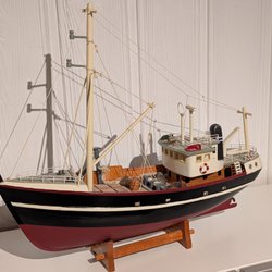En detaljerad modell av en ambulansbåt. Perfekt för samlaren eller som en dekorativ inredningsdetalj. Båten är detaljrikt utförd och står på en träsockel.