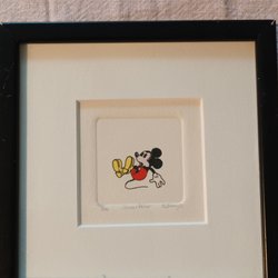 Ett charmigt konstverk föreställande Mickey Mouse i en dynamisk pose. Konstverket är inramat och redo att hängas upp. Perfekt för Disney-entusiaster och samlare.