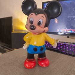 Musse Pigg figur i grön tröja och gula skor. Figuren har en svans och är märkt med ”© DISNEY” under ena foten.