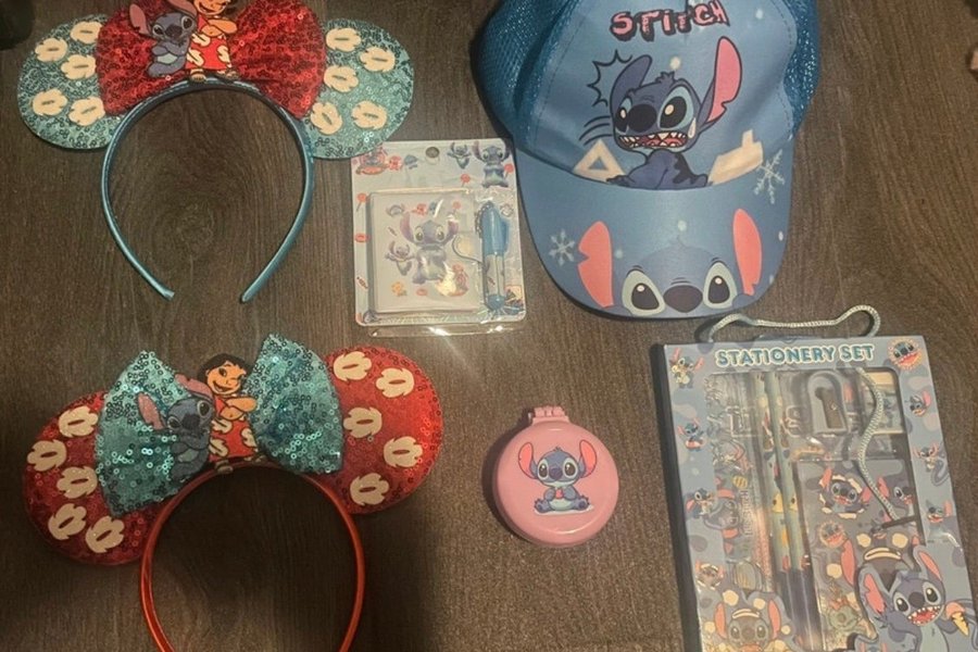Deze set bevat diverse Lilo & Stitch accessoires. Inbegrepen zijn twee haarbanden met pailletten en strikken, een blauwe pet met Stitch-afbeeldingen, een notitieset met pen, een compact spiegeltje en een uitgebreide schrijfwarenset.