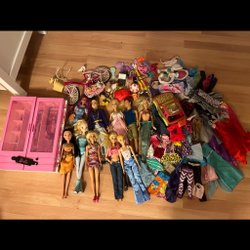 Två Barbie dockor med diverse kläder och accessoarer. Inkluderar flera outfits och skor.