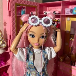 Docka med svart hår och ett diadem. Hon har en rosa topp med detaljer som liknar snäckor.