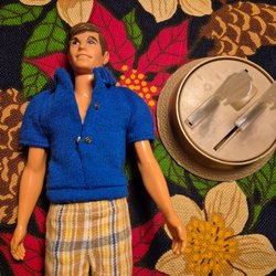 Ken docka med grå skjorta och silver slips samt vita byxor. Ingår också en stickad polotröja med hängselbyxor. Äkta Mattel. Lite skadad i halsen, se bild.