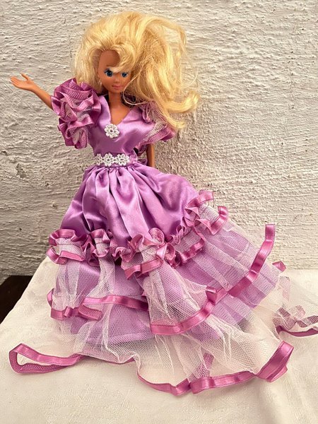 Barbiedocka med blont hår och blå ögon. Dockan bär en lila klänning med volanger och spetsdetaljer. Klänningen har en vit blomdetalj i midjan och på bysten. Klänningen består av flera lager tyg, inklusive ett yttre lager av tyll med lila band.
