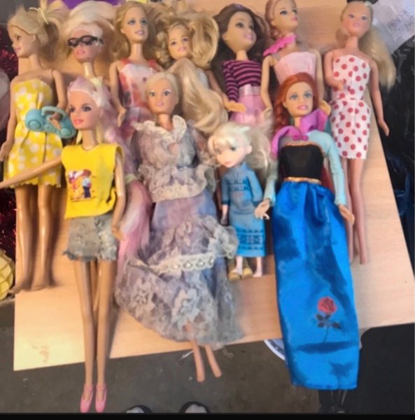 Parti med 11 Barbie-dockor och andra dockor. En docka är klädd som Anna från Frost och en annan som Elsa från Frost.