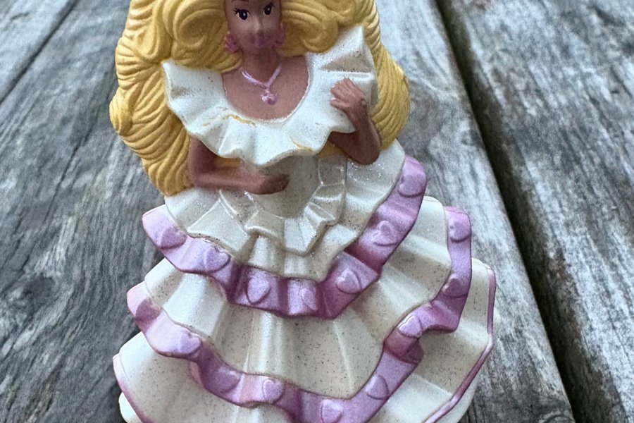 En söt Barbie figur med blont hår och en vit klänning med lila detaljer.