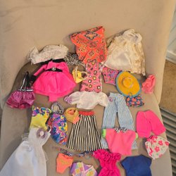 Fyra dockor med olika kläder och frisyrer. En docka har en blå bikini1995 Sparkle Beach Barbie, en annan har en lång rosa och turkos klänningBarbie Dreamtopia Sweetville Princess Candy Doll, en tredje är klädd i en gul brandmansuniform och den fjärde är en sjöjungfru med lila stjärt och glittrig topp.