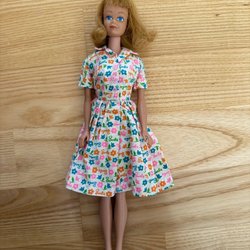 En vintage Barbie med röd peruk. Dockan bär en flerfärgad glittrig klänning och matchande blå stövlar. Medföljer gör även en blå kappa. På kappan har det lossnat sellofan