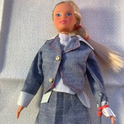 Barbiedocka med brunt hår och blå ögon. Dockan är tillverkad i Kina.