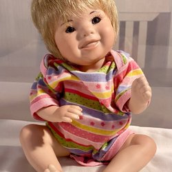 Fin porslinsdocka klädd i en gulddräkt och hatt, sittandes på en kudde. Spelar vackert och rör på sig med vred baktill.