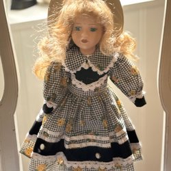 En vacker docka från The Princess Doll Collection av Kayene. Dockan har blont hår och blå ögon, klädd i en rutig kostym med matchande byxor och jacka. Den levereras med ett stativ. 42 cm hög.. behöver borsta håret