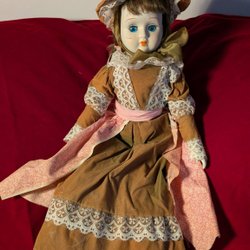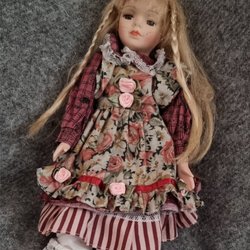 En vacker porslinsdocka med blont hår i flätor och en blommig klänning med bruna detaljer. 40 cm