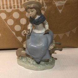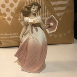 Ett par porslinsdockor, en pojke med mössa och en flicka i klänning. Det saknas dock en sko på pojken. 30 cm