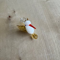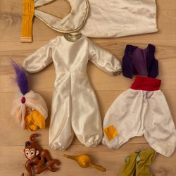 Fin porslinsdocka klädd i en gulddräkt och hatt, sittandes på en kudde. Spelar vackert och rör på sig med vred baktill.