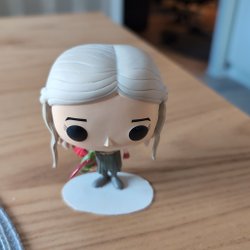 Docka med brun luva, svart väst och röda byxor. Dockan har detaljerade händer och ansikte.